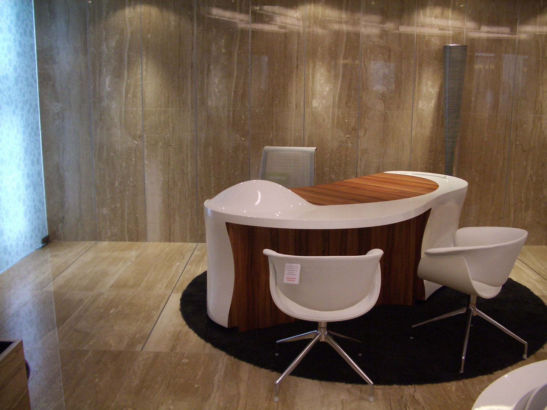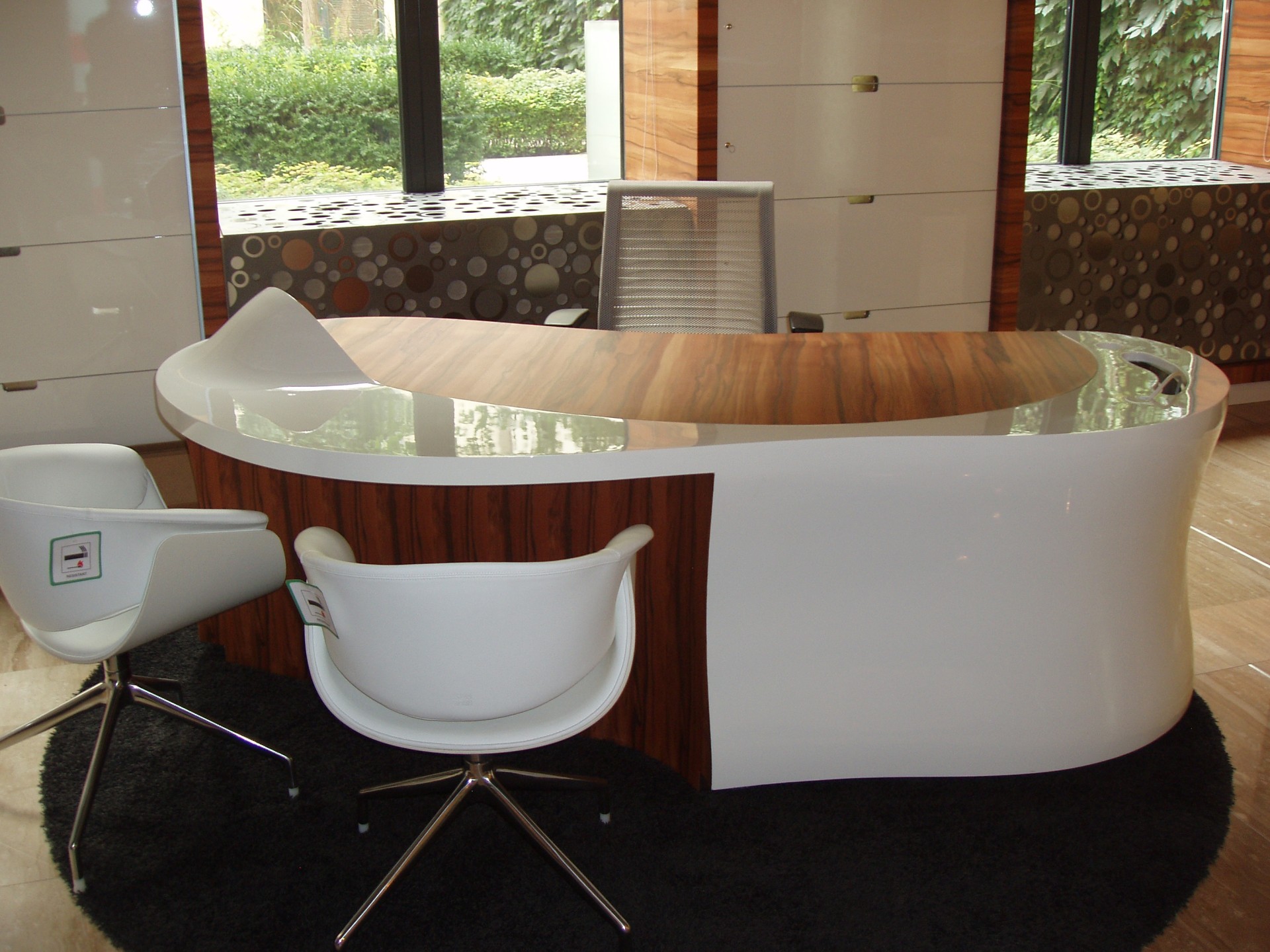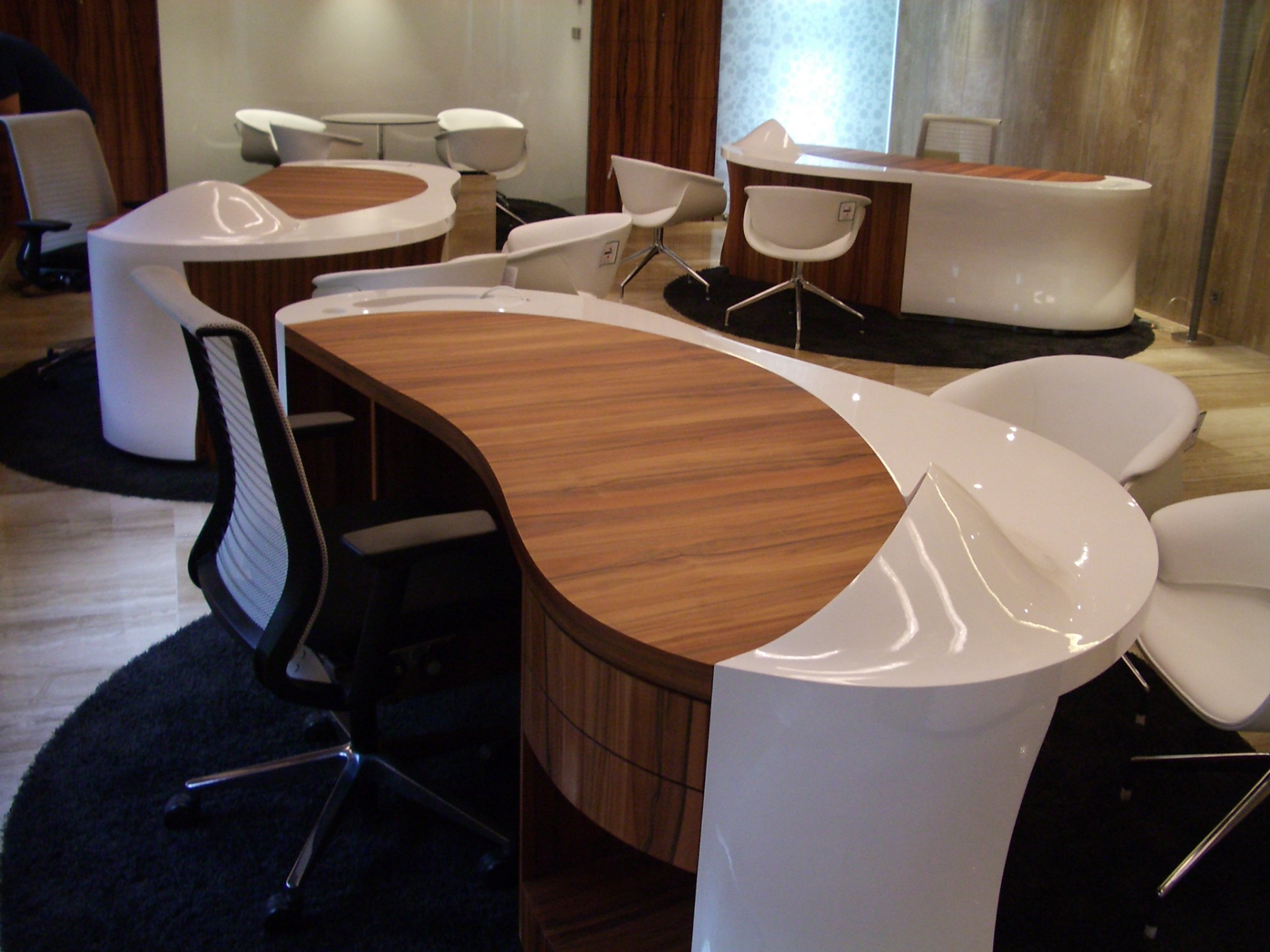 Production of tables combining laminate and wood for the bank interior.