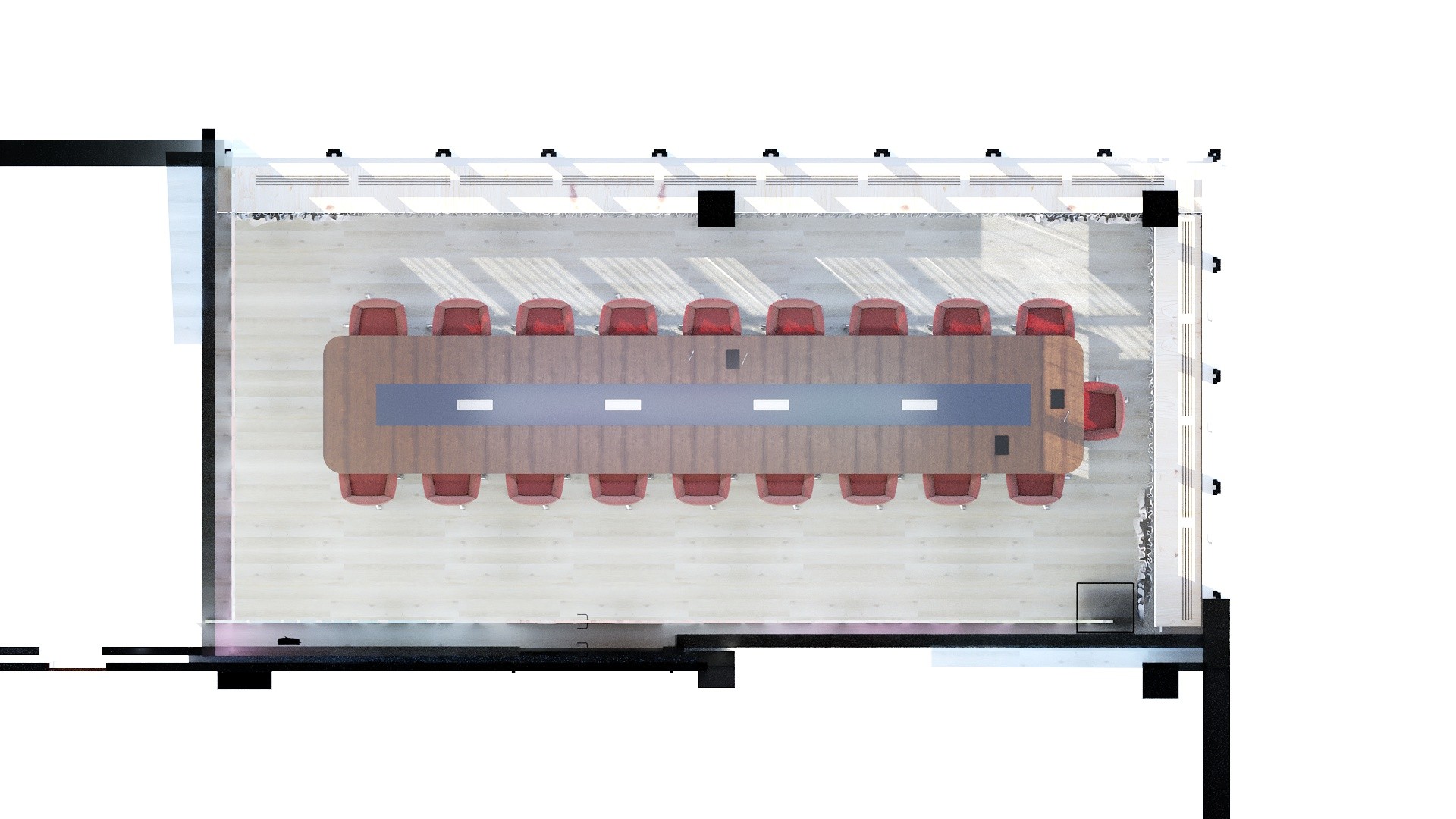 A sleek and minimalist meeting room with clean lines and a striking solid wood table. An interesting element is the illuminated wall with a 3D city map, which adds a distinctive character and visual dynamism to the space.